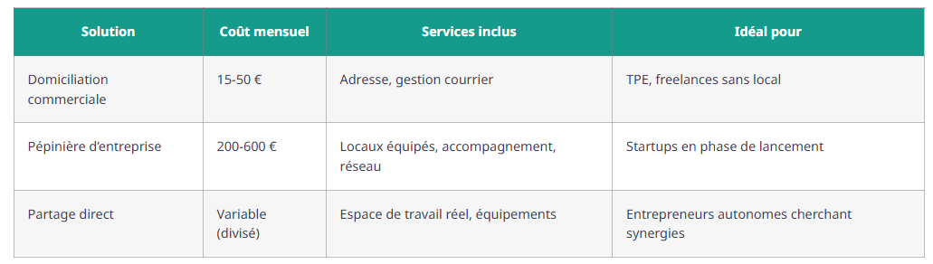 Les coûts varient selon la solution choisie. Pour une société de domiciliation basique, comptez entre 15 et 50 € par mois. Une pépinière d’entreprise avec services d’accompagnement peut coûter entre 200 et 600 € mensuels. Le partage direct d’un local permet de diviser les frais de location et de charges entre les entreprises, ce qui peut représenter une économie de 50 % ou plus.
